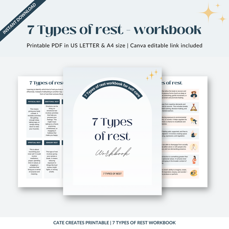 This self-care workbook is designed to help you figure out what kind of rest you actually need. It’s a gentle, supportive guide through the 7 different types of rest (yes, there are seven!), with practical ideas, reflection prompts, and space to check in with yourself.